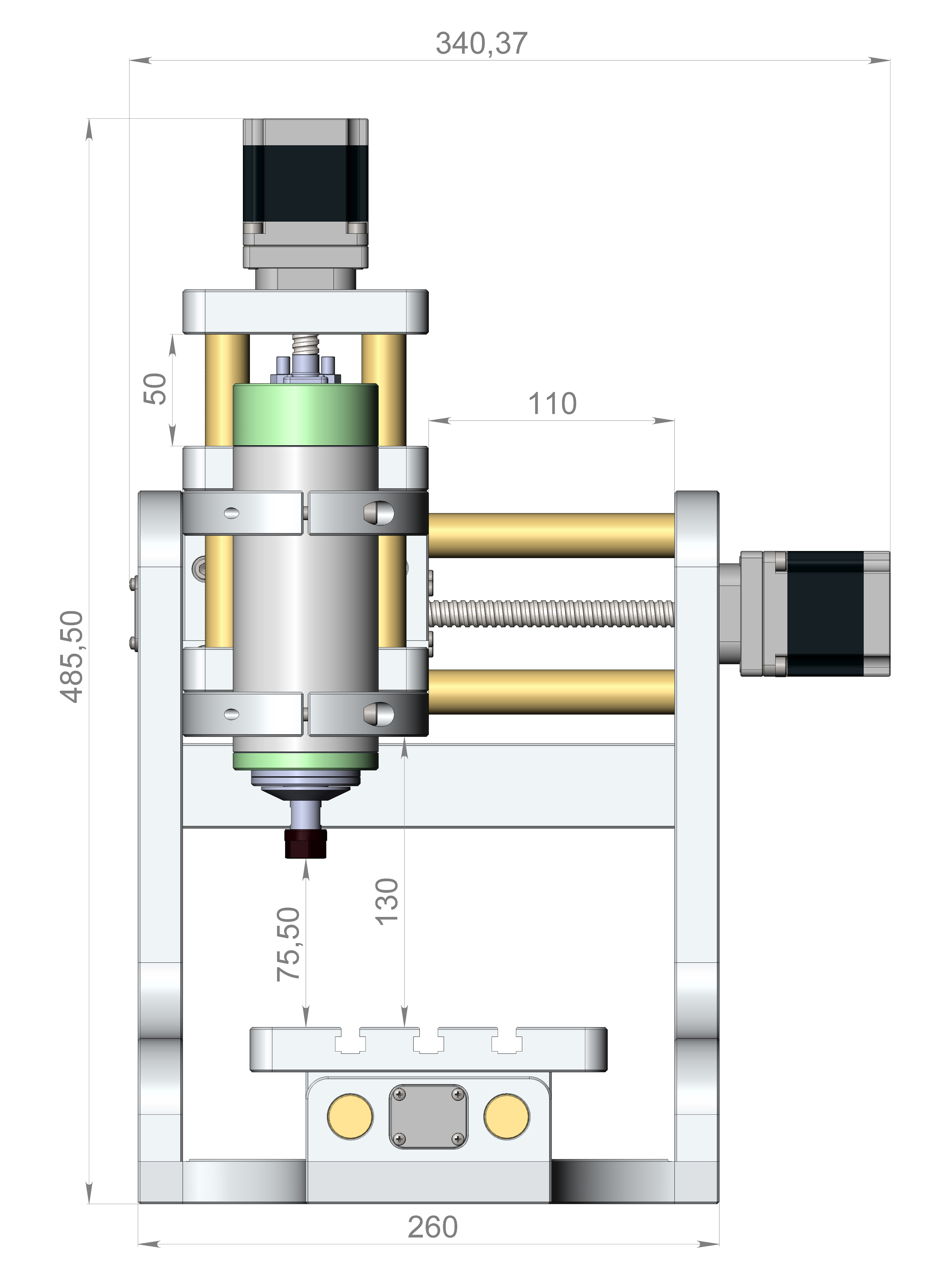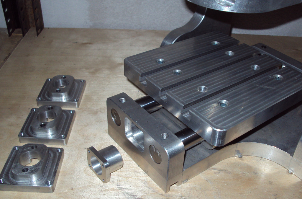 Рабочее поле данного станка 110х110х50, выполнен из дюраля Д16т 20мм, в качестве направляющих использованы полированные валы 20мм, а элементы скольжения изготовлены из антифрикционного материалла Zedex-100.
