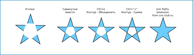 Иногда возникает нужда объединить два контура в один. И Ctrl+K и Сtrl+"+" не всегда хватает. Т.к. эти функции объединяют субконтуры в один контур. А иногда нужно объединить субконтуры в один субконтур. Объясню на примере: если мы нарисуем звезду из уголков и нажмем Ctrl+K или Сtrl+"+" в одном случае получим звезду с заливкой только этих уголков. В другом фигуру из треугольников, т.к. объединиение контуров при помощи Ctrl+"+" сначала делает контуры замкнутыми. А для правильного объединения нам нужно соединить близкие друг к другу узлы.