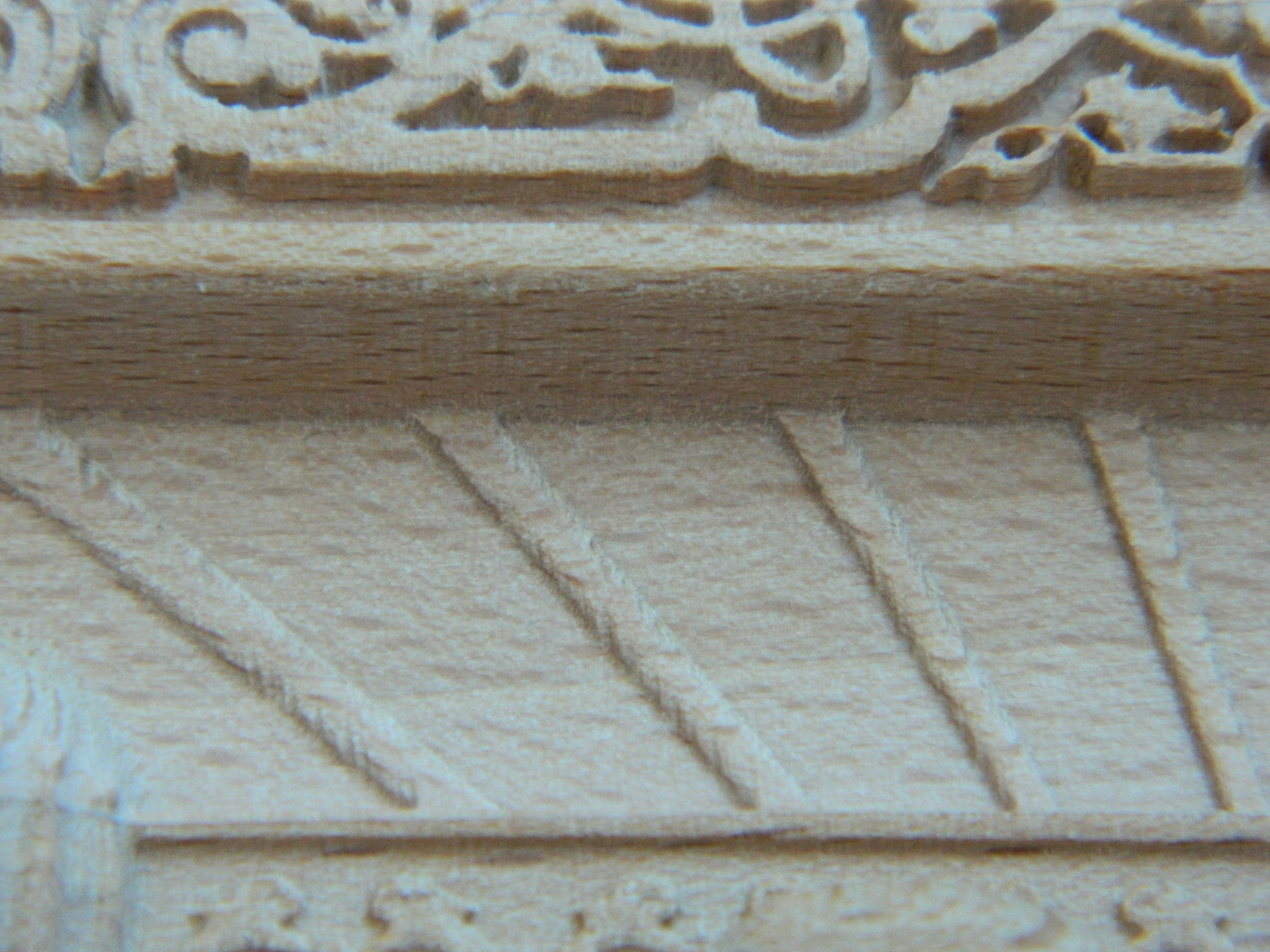 Чем тверже порода дерева, тем чище рельеф. Обязательно делал в Artcam уклон равный углу фрезы. Все щиты обрабатываю только поперек волокон.