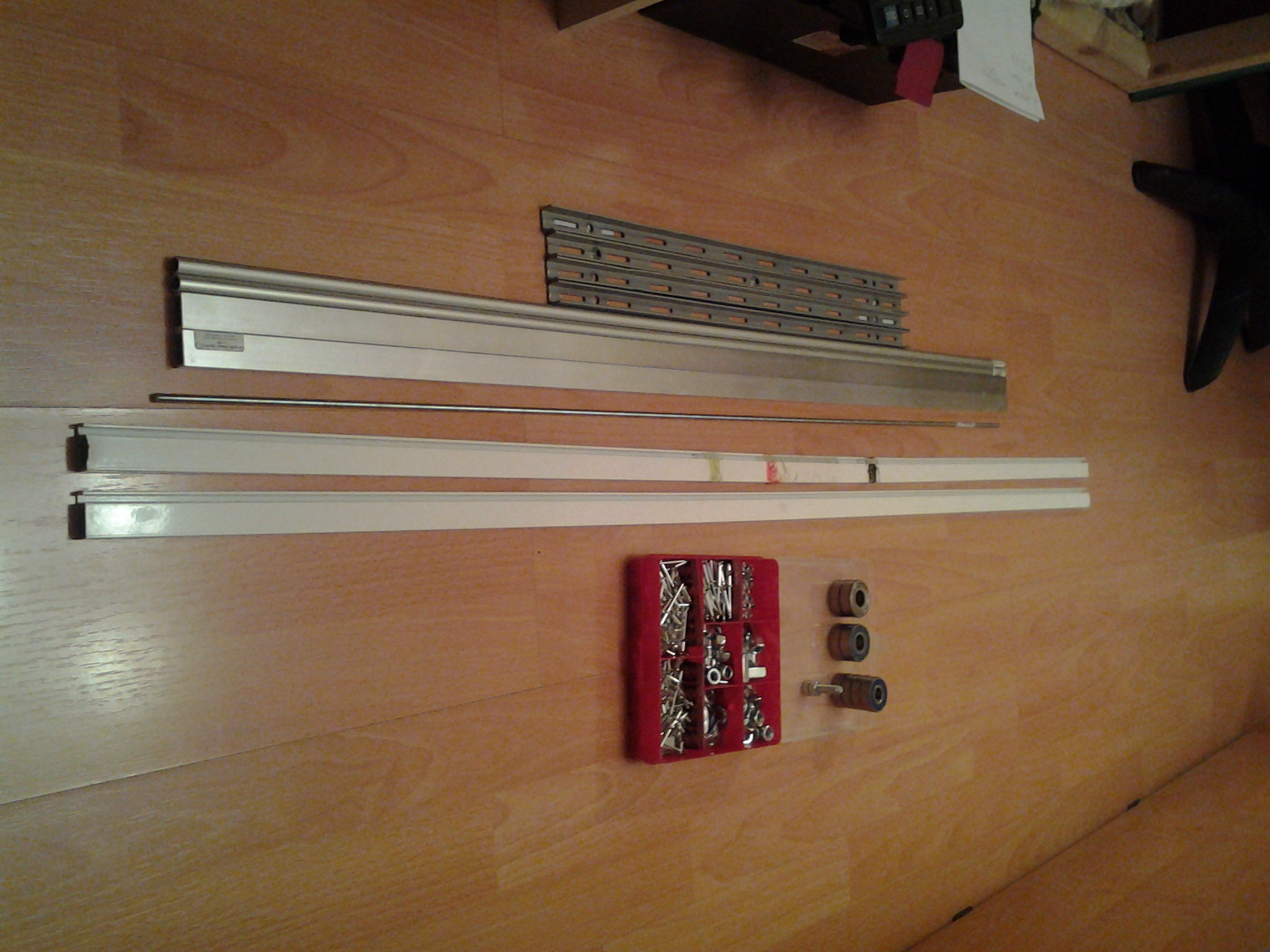 Также в Леруа Мерлен были куплены алюминиевые трубы прямоугольной и круглой формы. Также куплены четыре направляющие, шпильки M8 2 метра и M5 1 метр, большое количество заклепок и гаек. Поездка вышла на сумму примерно 1,5 тыс, фотка прилагается. Был взят с балкона давно найденный алюминиевый профиль, идущий вместе с москитными сетками для окон. Подшипники были куплены в ближайшем магазине автозапчастей на сумму 500руб. Т.к. ЧПУ не планировалось использовать под большие нагрузки, поэтому было решено использовать Б/У шаговики из принтеров, их я заказал у nERV, с запасом, под 4ю и пятую ось. За шаговики я заплатил 400р, а за отправление 550