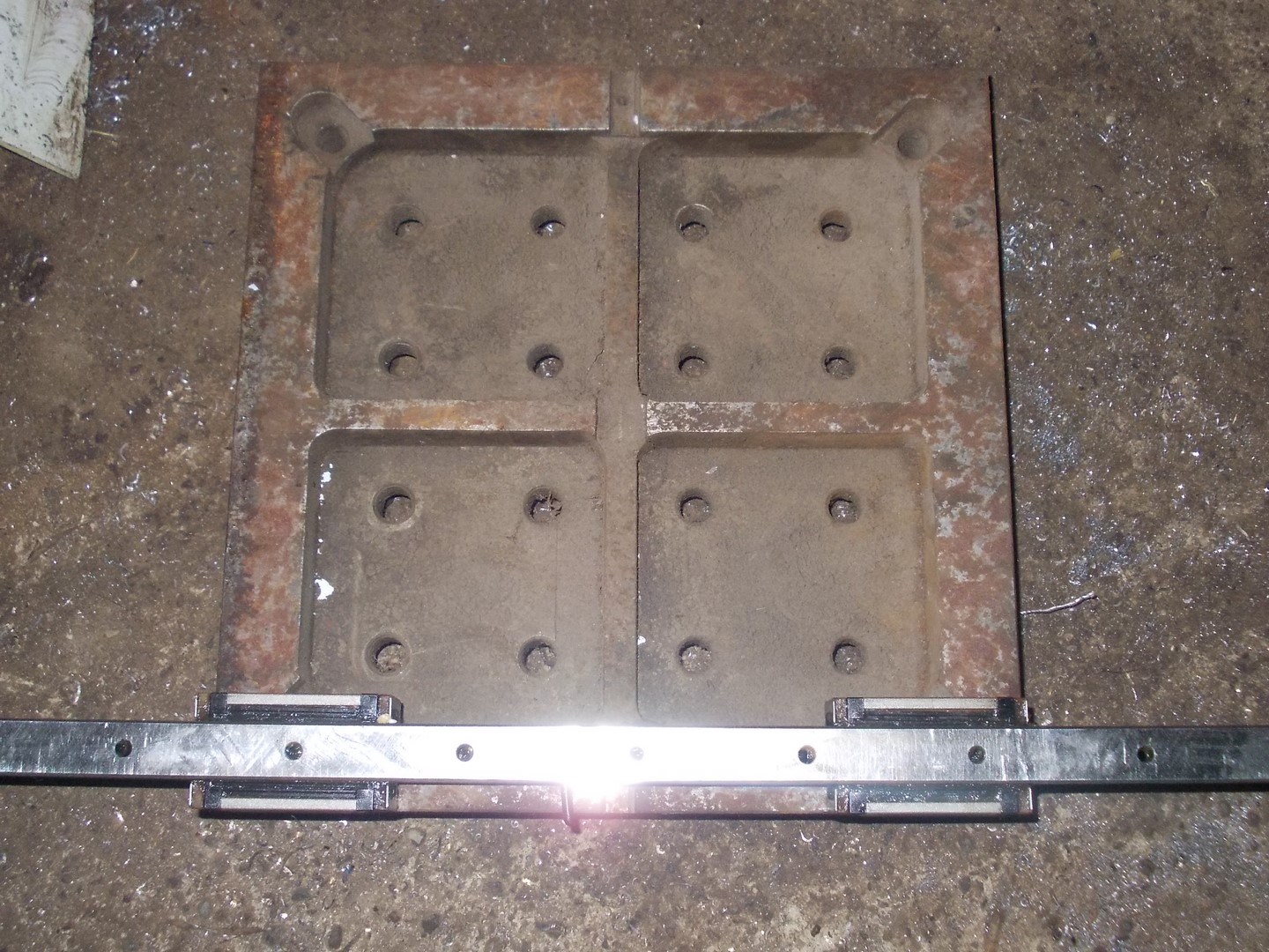 Я бы взял сталюку нужного размера 250х250мм толщиной 16-20мм, фрезернул посадочные места под каретки и отдал на шлифовку. Блочки прикручиваются к плите шлифованной, а потом к ней плита УСП. Получилось так: рельса-каретка-плита-плита УСП