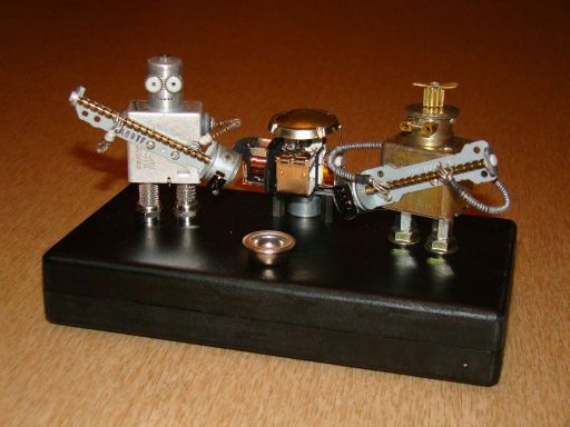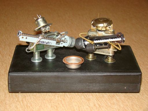 Внешний вид может быть любым, материалы - медь/латунь/сталь, радиодетали и разная металлическая мелочевка.