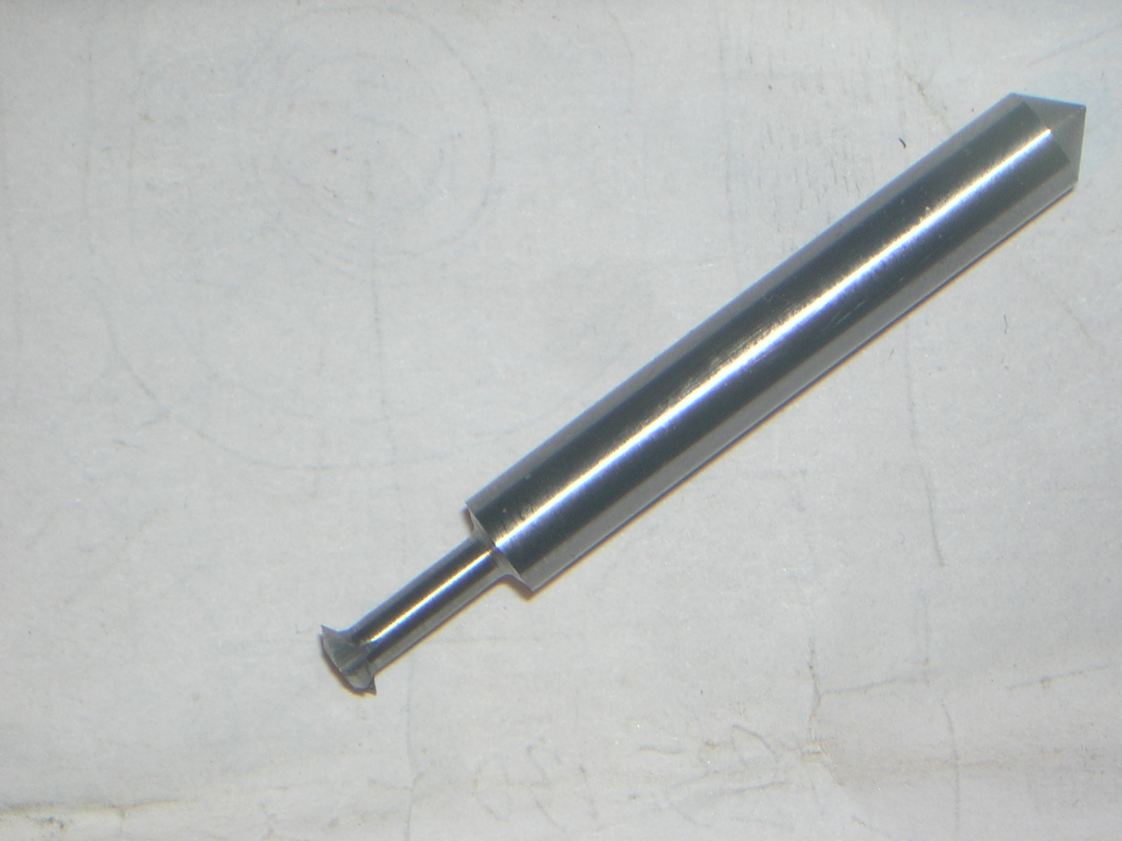 Резал вот этой фрезой, которую с нуля делал сам. В качестве заготовки взял совковую Ф8 с длинным хвостовиком. Спирали нарезал с обратной стороны стержня