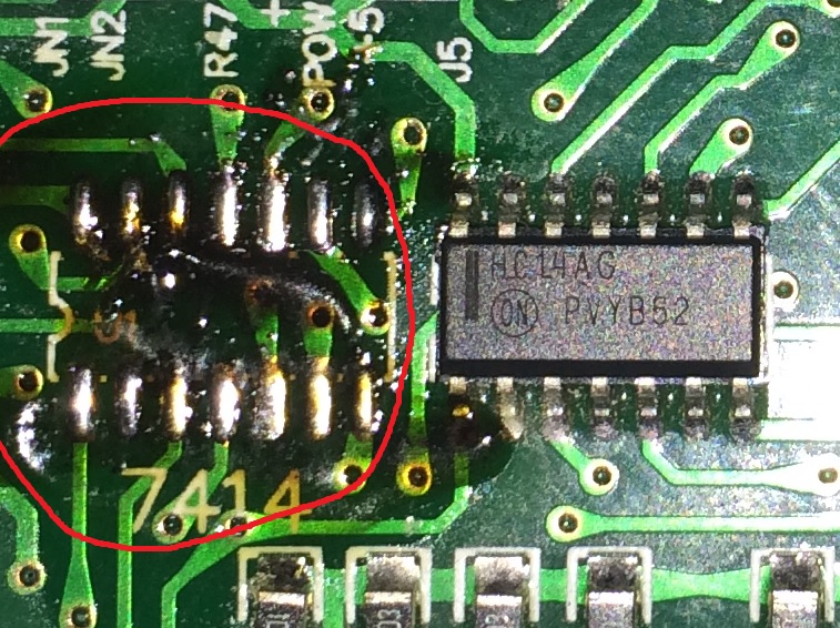 На плате сгорела микросхема HC14AG (сильно грелась), сюда по всему ток подал не правильно. Купить в интернете есть, но доставка займет очень много времени.