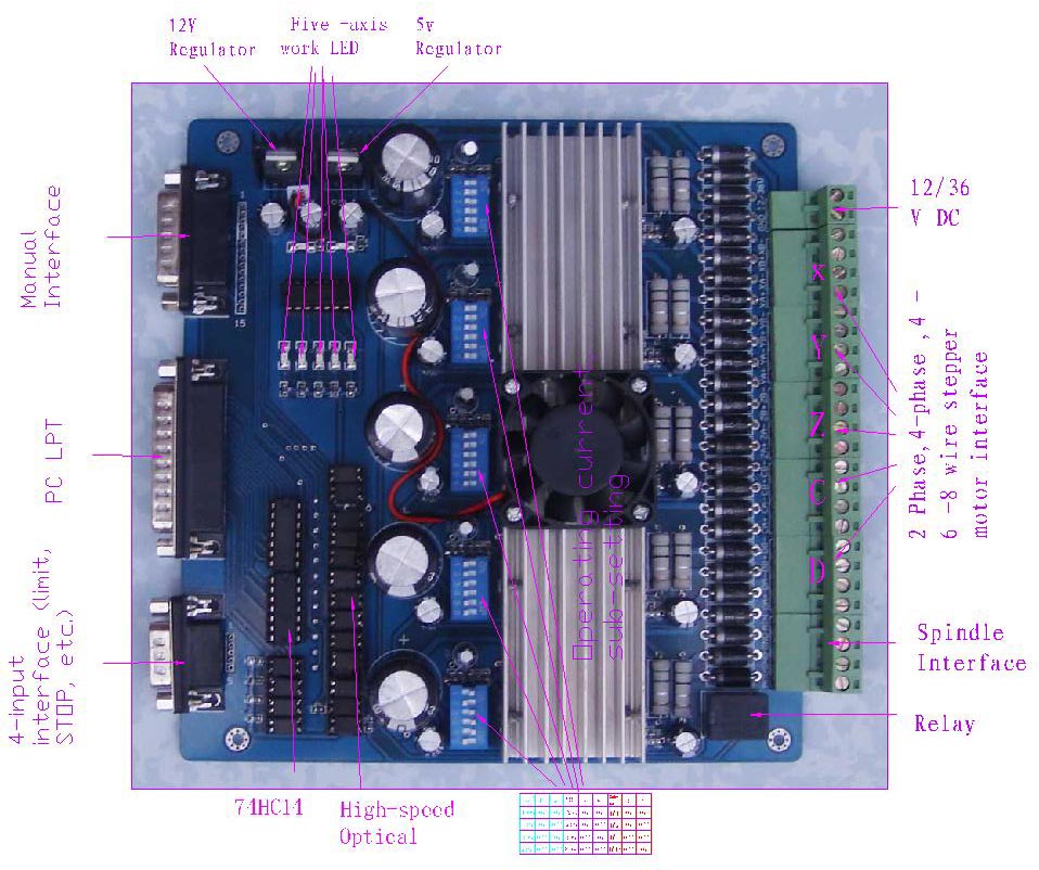 4) Приколы с пинами не обошли меня стороной - сначала я перепробовал все возможные комбинации (на советской логике) оказалось что только 16 пин LPT дает step, direction вообще никто не дает, и что характерно что работает это чудо даже без Enable. По инструкции правильная комбинация 16 - step, 4 - dir, 14 - enable для всех осей, но при новых 74HC14N правильно только светодиоды загораются, если заменить на 14 - step - то двигатель издает тихое урчание или даже пробует куда-то дернуться влево или вправо - хаотично, смена порядка контактов двигателя ничего не дает, причем это дело делается аналогично на всех осях (теперь включаю по 1-й). Также на 2 пине у меня вроде реле - и на оси Х оно залихватски щелкает, но на остальных осях - плата тихонько издает звук взлетающего самолета - я так понял что какая то хреновина собирается сгореть и дольше секунды я пин 2 не включаю. Проверял включение мониторами LPT - их я несколько надыбал - да и сигнал приходит на плату - тестером тестил