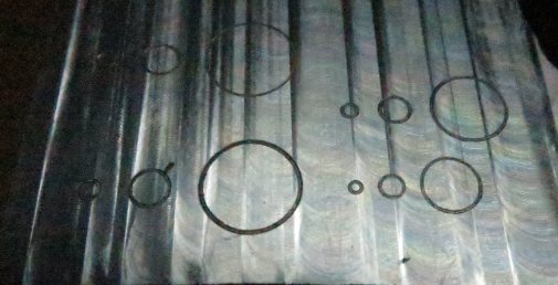 Также нарезал кружочков разного диаметра, самые маленькие 0.6 и 0.8 мм, изображение прилагается. Овальность их вызвана кривостью микроскопа(вебкамера по сути), я делал 2 изображения каждого с поворотом на 90 градусов, овальность остается горизонтальной, пропорции совпадают.