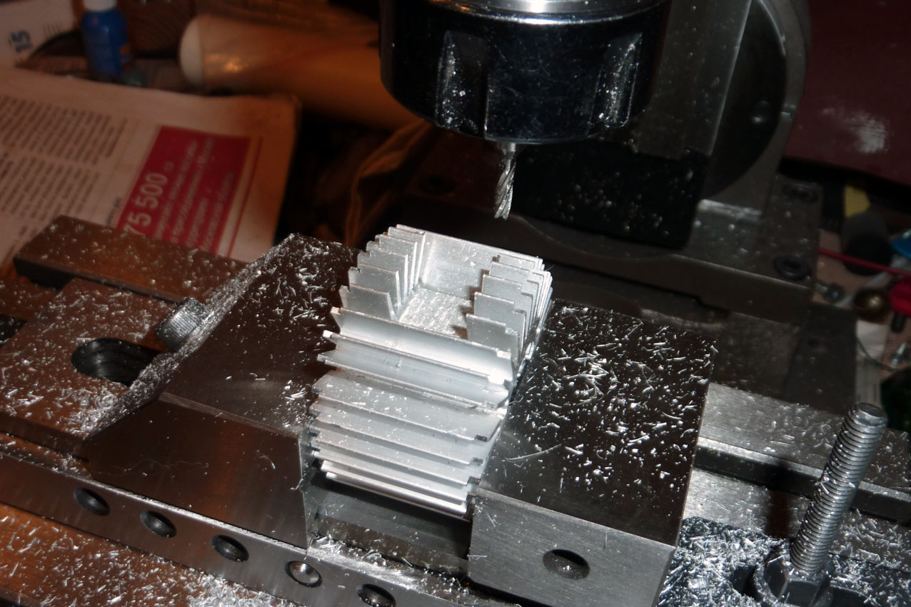 к радиатору, для этого фрезерую плоскость, срезаю лишние ребра у радиатора, и нарезаю резьбу М8х1мм.