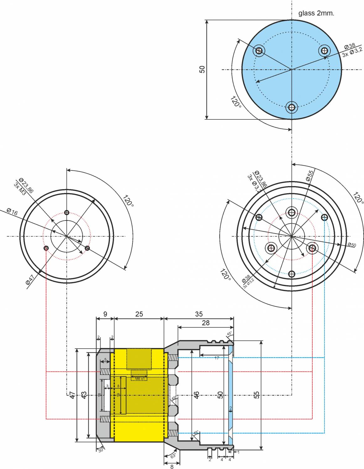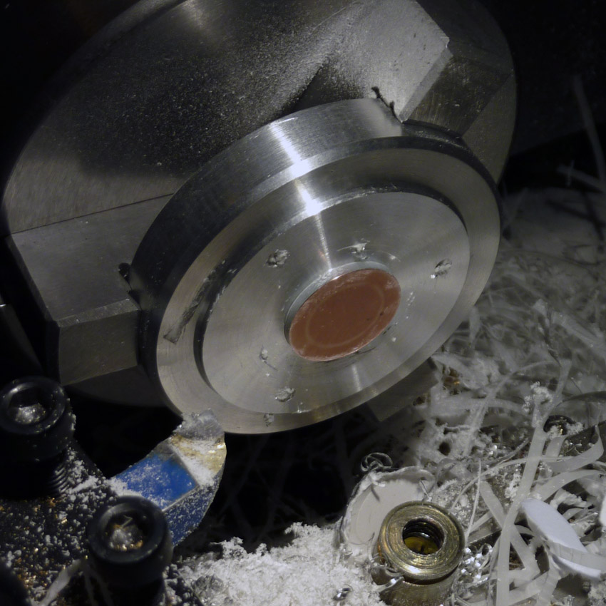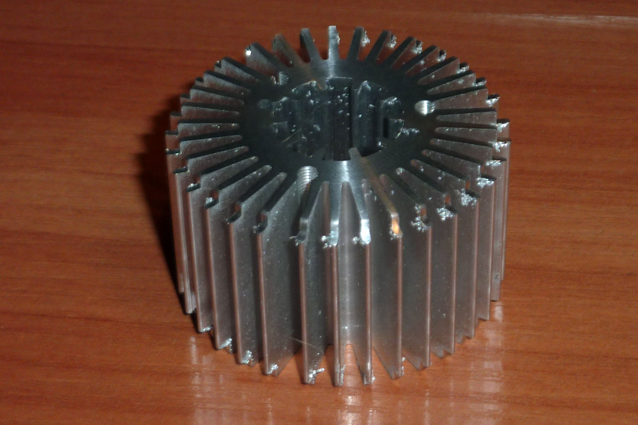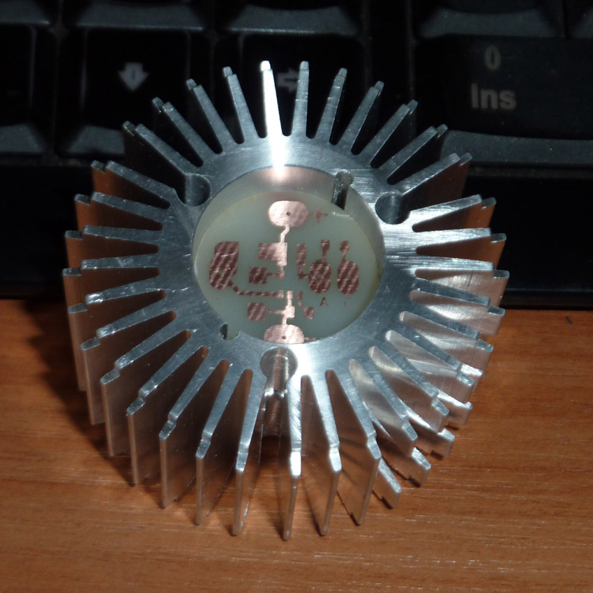 купил переходник или удлинитель с гибким "шлангом" всё удаляю "шланг" оставил светодиодный модуль 3W, около 240 Люмен + вторичная оптика, каждая линза имеет угол 30°, он сделан так, что можно не посредственно запитывать от 12 Вольт в цепи стоят 2 тока ограничительных резистора СМД, я удалю их и поставлю драйвер, чтобы жизнь светодиодов была долгой и без проблемной. чертеж материал деталей плафона это кругляк Д16Т и радиатор на чертеже он желтого цвета. Зажимаю кругляк, юстирую чтобы не "било" снимаю "мясо" то есть лишний металл, до нужных размеров внешний вид так сказать у плафона закончен, теперь следует внутренняя расточка, с начало сверлами от минимума до максимума, потом резцом отрезаю, из остатка материала делаю 2ю деталь, дно\крышка плафона торцы после отрезания в чистовую на радиаторе небольшой съем для сочленения с другими деталями детали почти готовы