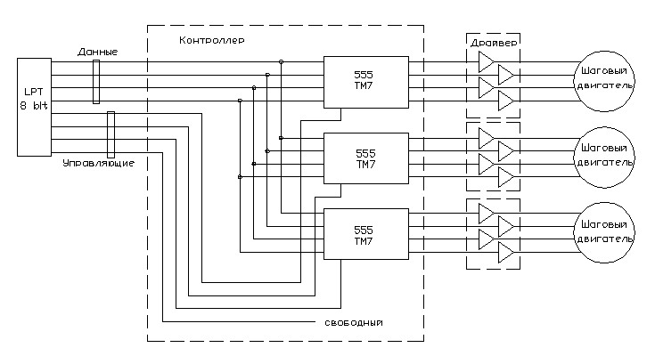 Описанный выше контроллер проще тем, что в контроллере даже логика не нужна. Но это занимает в два раза больше пинов LPT, которые у нас в дефиците, т.к. обычно помимо самих двигателей еще хочется подключить датчики и прочую ерунду :).