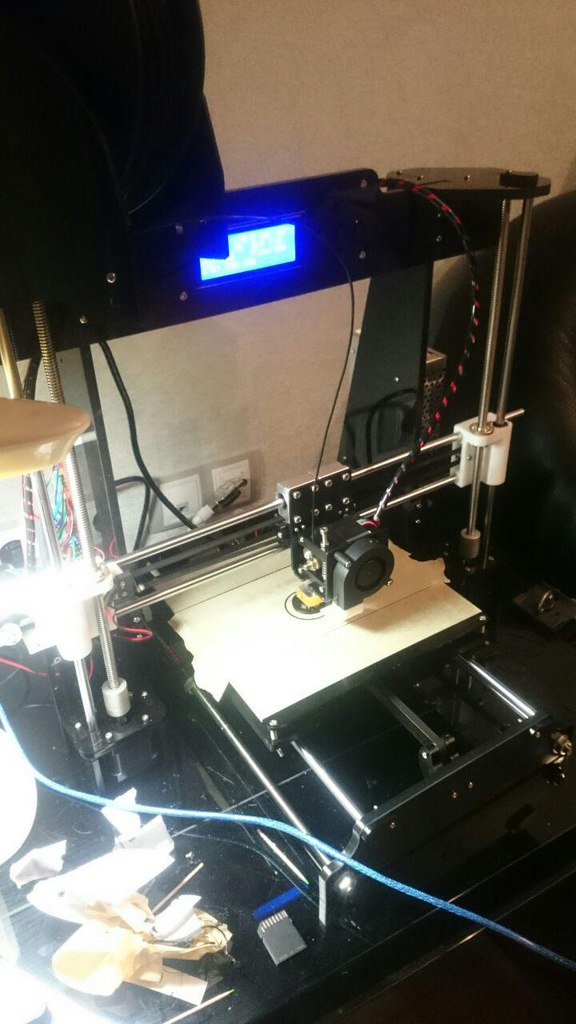 Пока собирается фрезерный ЧПУ станок, решил быстренько собрать 3d-принтер. Так эта вещь больше игрушка, чем полезный инструмент, решил брать наиболее дешевый и популярный, им оказался размноженный на различные конфигурации и вариации Prusa i3. Китайцы ими в огромном кол-ве торгуют. Просмотрев несколько вариантов, взял "проапгрейженный": дисплей на верху в рамке, наличие упора для катушки, алюминиевый стол, охлаждение сопла и экструдера. В подарок две катушки нити на выбор и 8гб карта. В общем, ничего особенного, но пусть будет. А, ну еще и поле не 200x200 а 210x210.