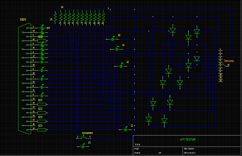 Вот схема LPT-TESTERA ,т.е. диодный шифратор преобразует десятичный входной сигнал от десяти входных линий в 4-разрядный двоичный .