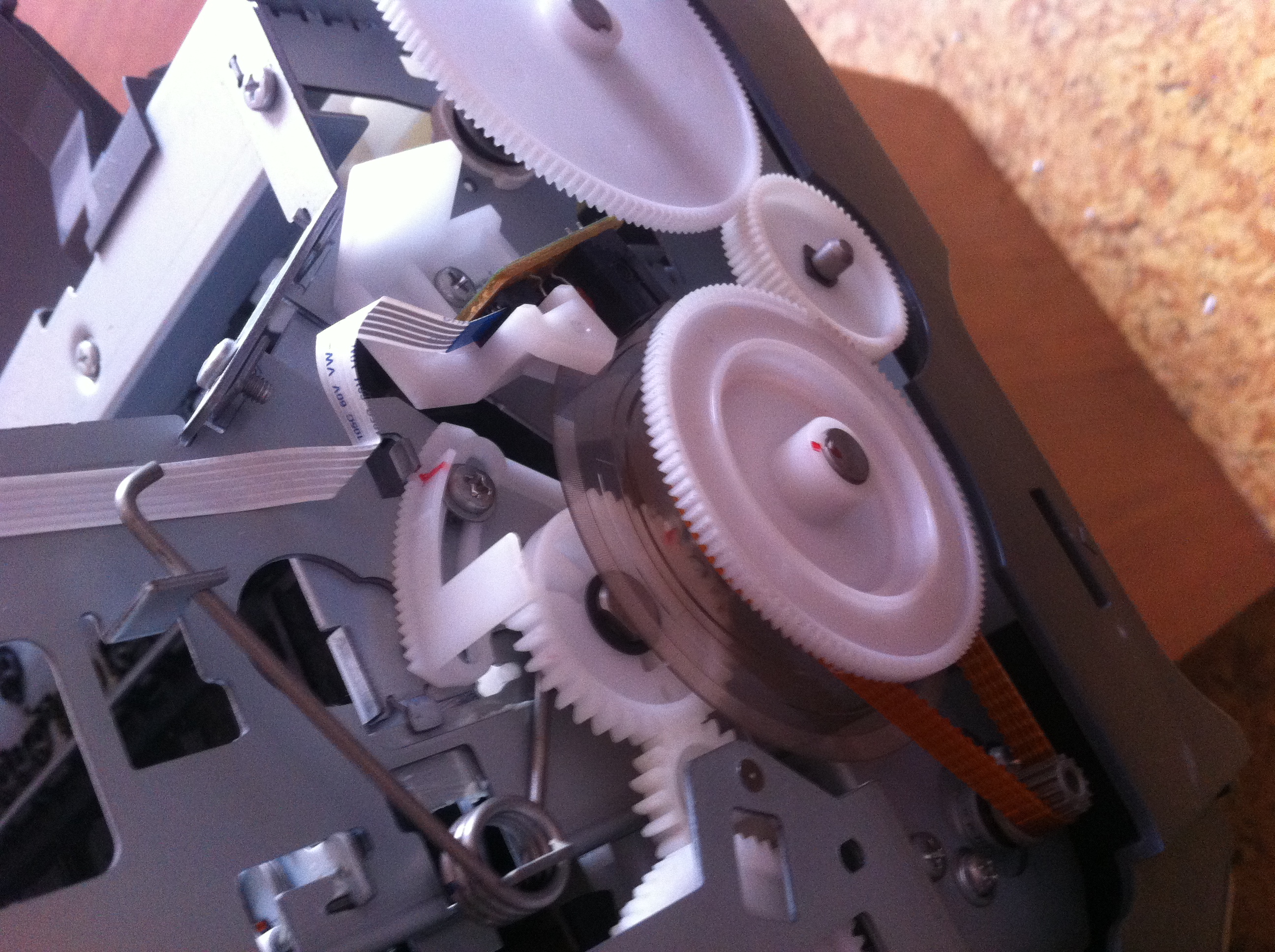 К слову - занимался похожей приблудой, только вместо тягания ВСЕГО принтера тягался лёгкий столик средствами самого принтера - протяжка бумаги вынималась, разбиралась, добавлялась "П-пластина"(ибо на валах протяжки обычно держится нижняя часть железок принтера) на которую цепляли мебельные напрвляйка, поверх направляек ложили пластину, к концам напрвялек цепляли зубчатый ремень, шкив ремня вешался на укороченный конец вала протяжки бумаги.