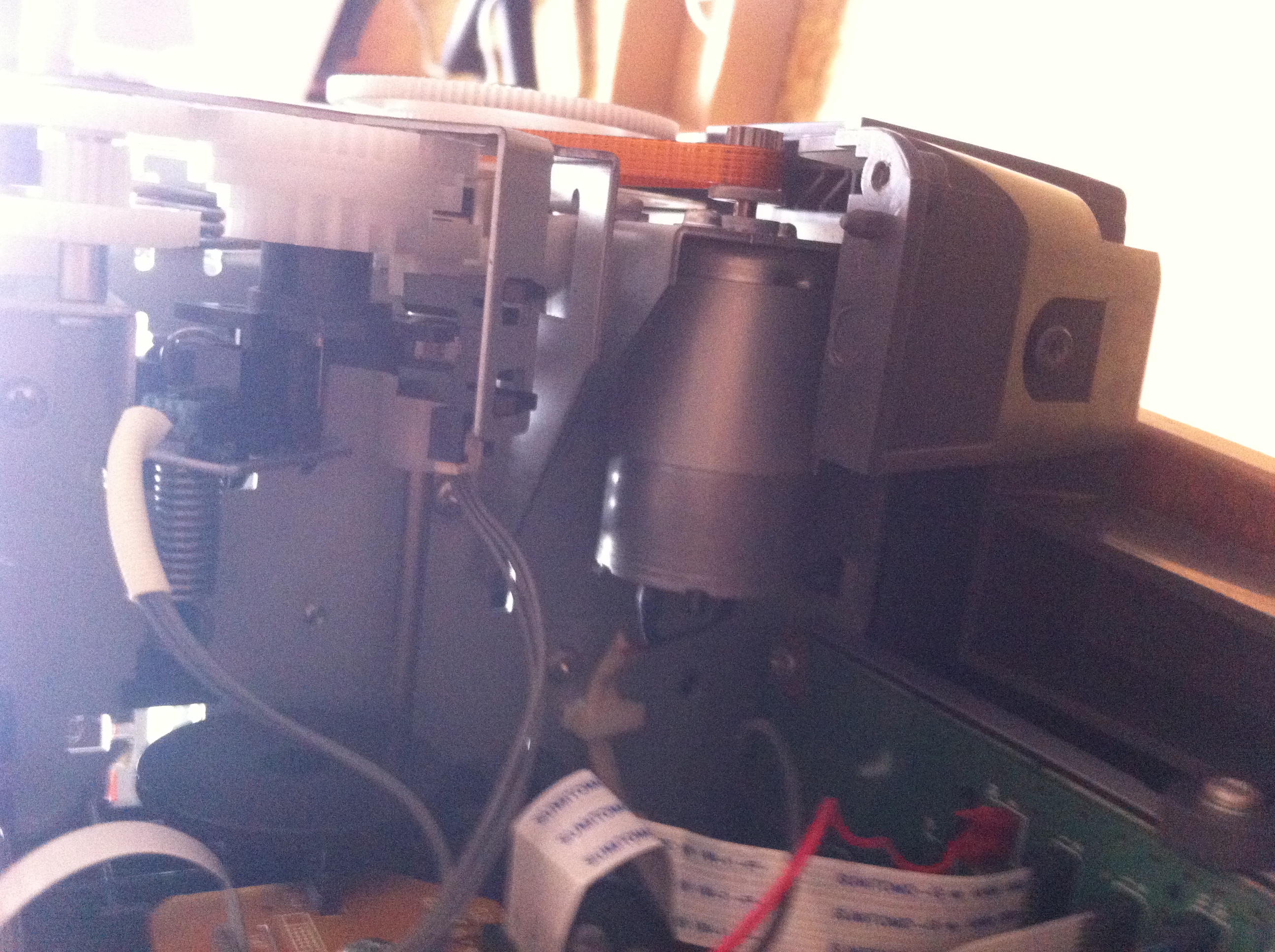 Управление там всё то-же -думаю вы заметили шнурок сзади устройства? Этим шнурком приблуда цепляется к цепям управления протяжкой в принтере, через этот-же шнурок прицеплен энкодер. А двиг внизу всё тот-же "коллекторный" двухвыводный, просто чуток мощнее и подключённый через драйвер.