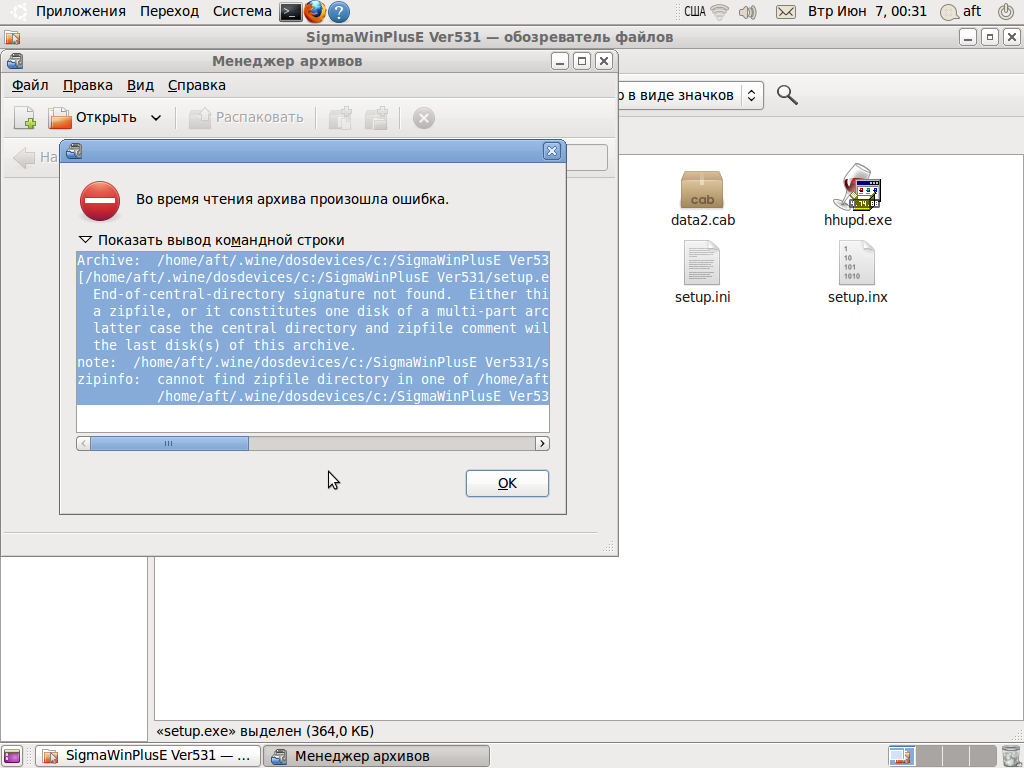 zipinfo: cannot find zipfile directory in one of /home/aft/.wine/dosdevices/c:/SigmaWinPlusE Ver531/setup.exe or